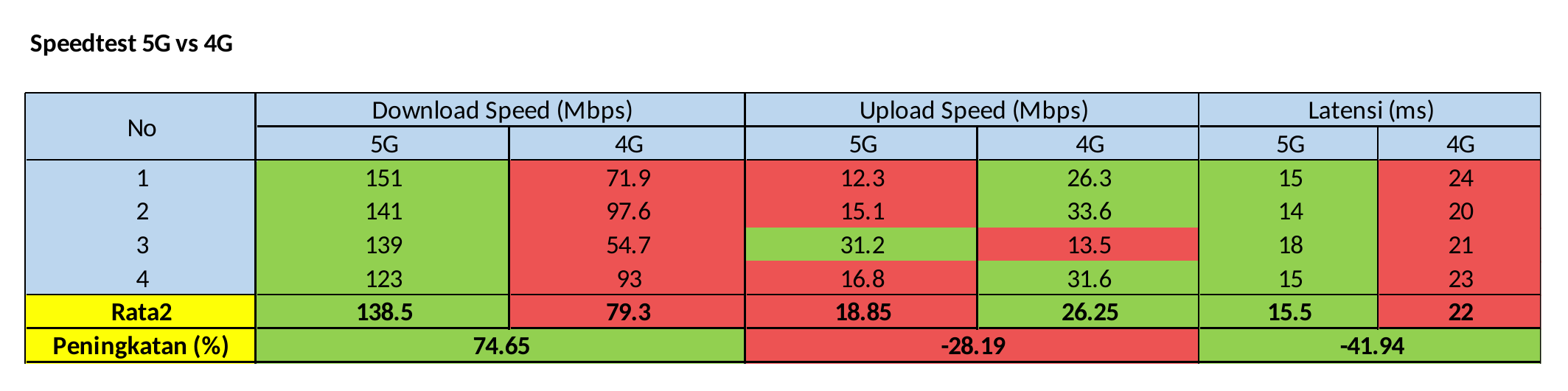 Kalo dilihat persentase nya dengan koneksi 5G kecepatan download nya meningkat sampai 74.65% — atau nyaris meningkat 2x lipat ya dengan kecepatan rata2 138.5 Mbps, latensinya juga lebih cepat 41.94% di koneksi 5G — tetapi sayangnya untuk kecepatan upload malah turun sekitar 28.19%