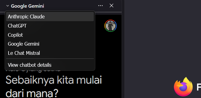 Seperti yang telah kita tahu, saat ini Firefox hanya memiliki fitur AI utama yaitu AI Chatbot Sidebar dimana fitur ini memungkinkan pengguna untuk memilih chatbot seperti ChatGPT, Gemini, Copilot, Claude dan lainnya.