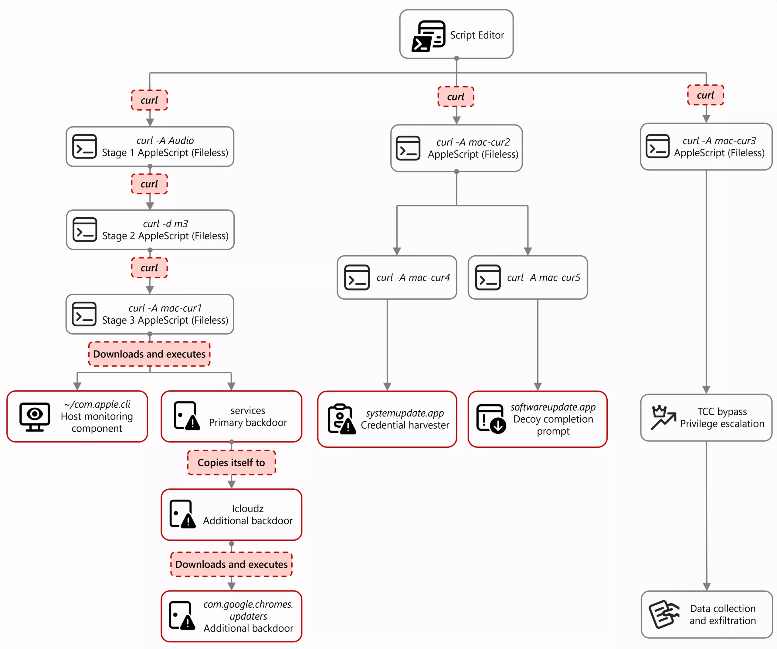 Namun, file tersebut sebenarnya adalah AppleScript yang akan terbuka di Script Editor bawaan MacOS, sekilas memang terlihat normal, namun script ini berisi ribuan baris kode dengan malware yang disisipkan dibagian tertentu. Saat korban diminta menjalankan script tersebut, serangan langsung dimulai.