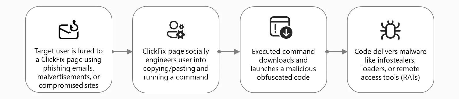 Cara kerja dari ClickFix ini bervariasi dan berbeda tergantung dengan target-nya, paling umum adalah bisa berupa phishing email dan pesan palsu, intruksi copy paste dari suatu tutorial namun nyatanya ini malah menghubungkan ke server si attacker, dan tampilan yang menipu seperti misalkan Windows Update atau prompt CAPTCHA palsu.