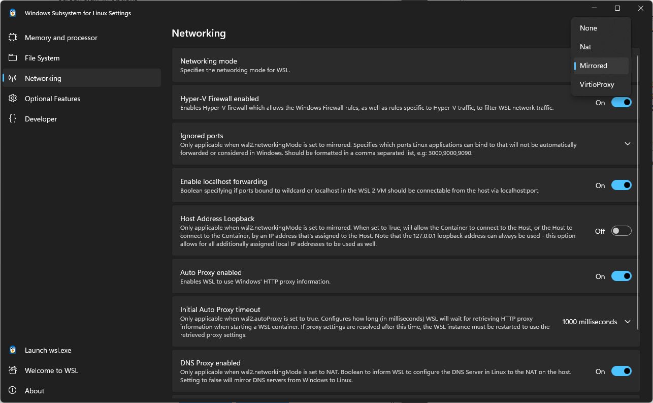 Hingga perbaikan resmi dihadirkan, solusi bagi kamu yang terkendala masalah ini adalah dengan mengubah mode jaringan WSL dari Mirrored Networking ke NAT.
