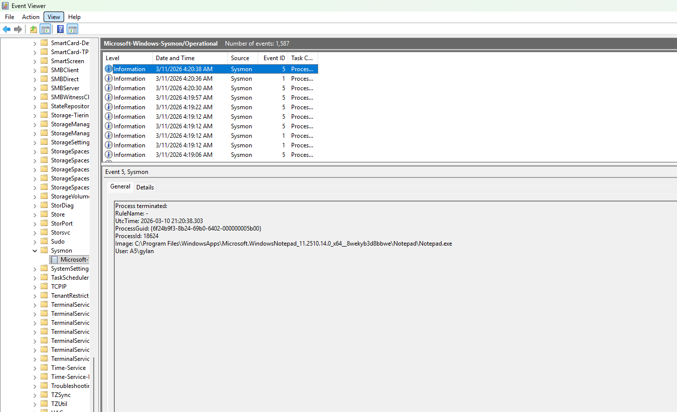 Oh iya, log di event viewer bisa kamu lihat pada directory Applications and Services Logs > Microsoft > Windows > Sysmon > Operational.