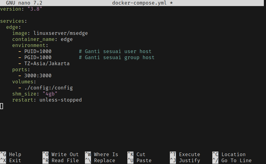 Langkah 3. Lanjut mari kita buat folder khusus dan docker-compose.yml. Nah disini saya akan menyimpan file dan konfigurasi Docker ini di ~/_docker/msedge-docker/