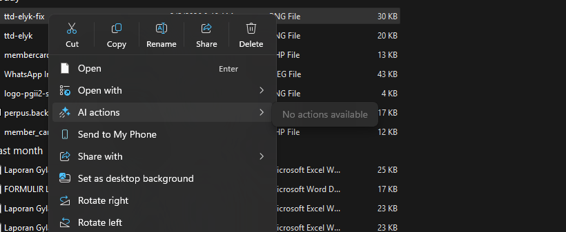 Nah bisa di lihat bahwa sudah tidak ada Actions apa pun yang bisa kita pilih, hanya saja opsi AI actions masih ada di Context Menu.
