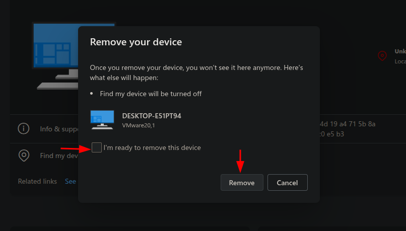 Selanjutnya silahkan centang opsi “I’m ready to remove this device” > kemudian klik Remove.