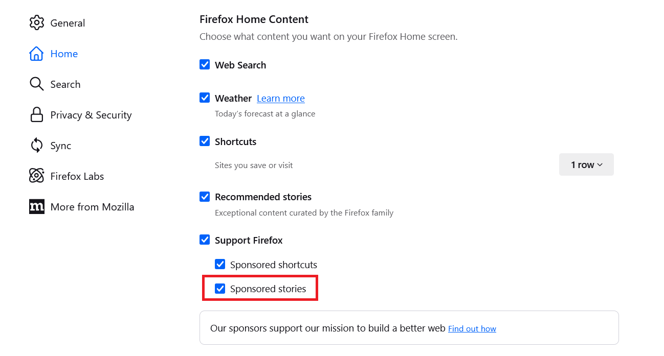 Nah dibeberapa region mungkin kamu akan melihat opsi Sponsored Stories, namun di Indonesia, opsi tersebut tidak tersedia, jika ada dan kamu ingin nonaktifkan, dihalaman Firefox Settings > Home > Silahkan disable opsi Sponsored Stories.