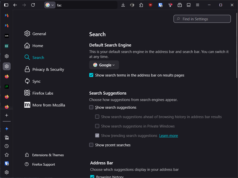Langkah 2. Untuk menghilangkan Suggestion di bagian Address bar, kamu bisa masuk ke Firefox Settings > Search Suggestions.