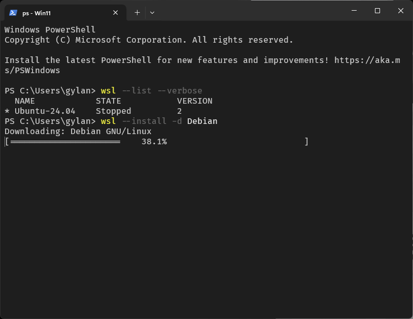 Langkah 2. Setelah dipastikan bahwa Ubuntu-24.04 saya ada dan saya juga sudah menggunakan WSL versi 2, mari kita lanjut dengan menjalankan perintah berikut untuk melakukan instalasi Debian.