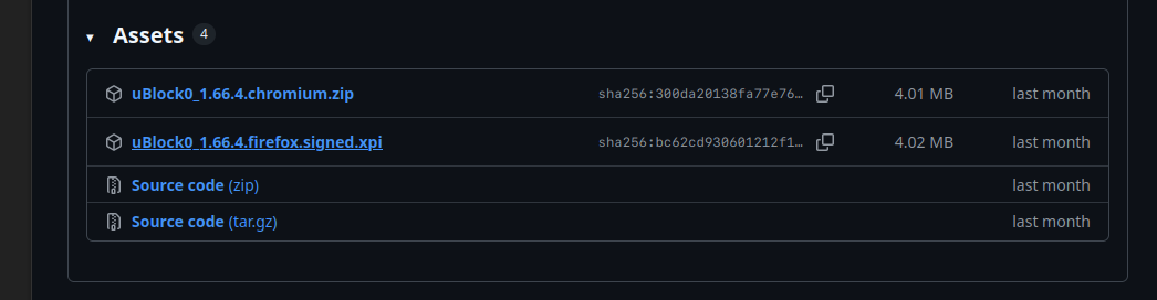 Langkah 1. Pertama silahkan kamu download file uBlock Origin dari halaman GitHub berikut (pastikan pilih yang release stable dan download versi firefox.signed.xpi).
