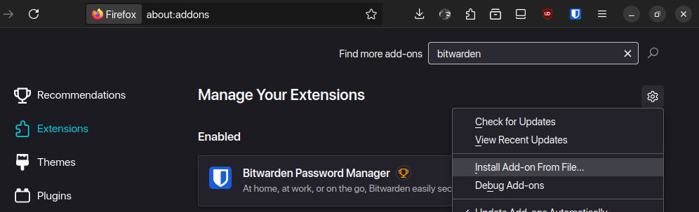 Langkah 2. Setelah file di download, silahkan kamu kunjungi halaman about:addons > extension > klik icon gear dan klik Install Add-on From File.