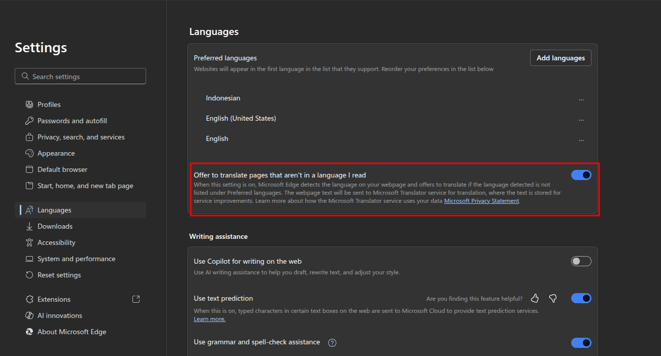Jawabannya bisa guys, dan sangat mudah untuk kita lakukan kok, caranya sangat sederhana, cukup kamu masuk ke halaman Edge Settings > Languages > Kemudian disable opsi “Offer to translate pages that aren’t in a language I read”.