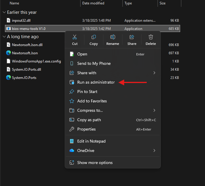 Langkah 2. Selanjutnya, silahkan kamu buka file aplikasi bernama bios-menu-tools V1.0 silahkan buka dengan cara klik kanan > Run as Administrator.
