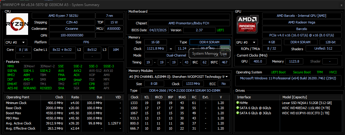 Nah secara umum, VRAM sendiri merupakan sebuah memori yang dipakai GPU untuk menyimpan tekstur, buffer, dan data grafis, dan sayangnya di perangkat GEEKOM A5 yang saya gunakan ini, iGPU Radeon Vega di Ryzen 7 5825U tidak punya VRAM fisik sendiri, sehingga VRAM iGPU diambil dari RAM sistem (shared memory), jadi semakin besar RAM yang tersedia, semakin fleksibel alokasi memori untuk GPU.