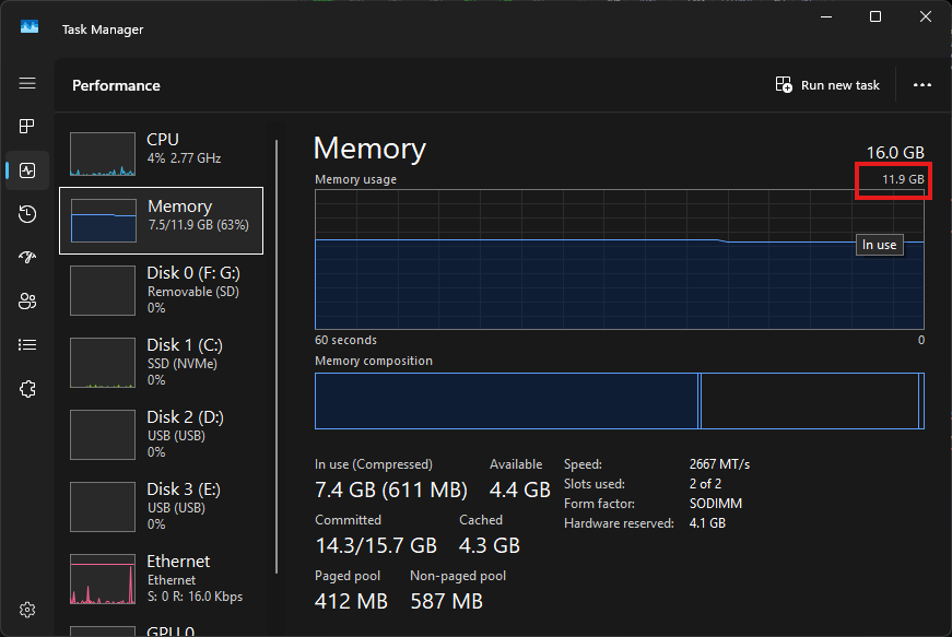 Jawabannya jelas iya dong, karena VRAM di iGPU AMD ini benar benar mengandalkan RAM, dari total 16 GB RAM yang saya pakai, 4 GB saya atur agar menjadi VRAM, imbasnya jelas, maksimal Memory Usage berkurang menjadi hanya 12 GB saja.