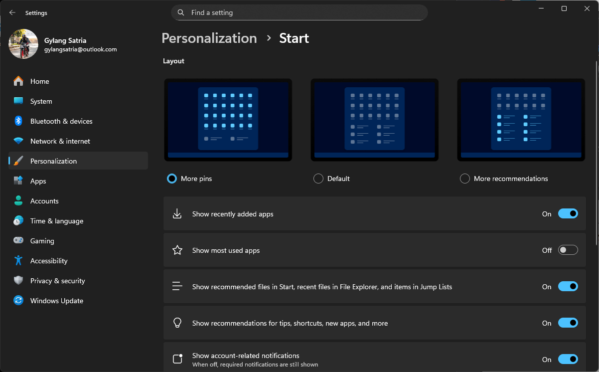 Nah dihalaman Settings, kita bisa mengatur bagian ini dengan menampilkan lebih banyak Pinned Apps atau Recommended.