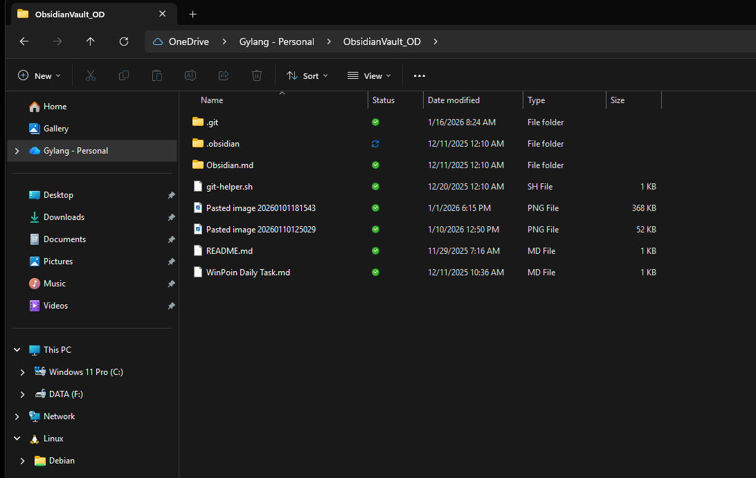 Nah contohnya seperti pada gambar diatas, saya menyimpan Vault di OneDrive, dimana setiap perubahan akan langsung tersimpan di cloud, jika saya membuka Obsidian di perangkat Windows lain dengan akun Microsoft yang sama, saya cukup buka Vault tersebut saja.
