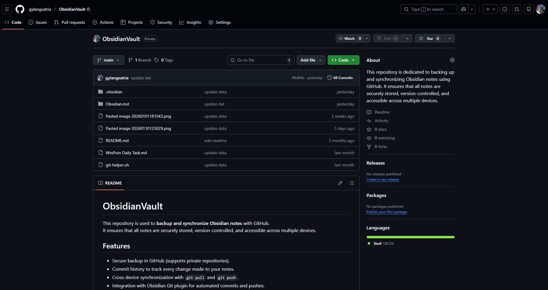 Nah untuk kamu power user atau sudah terbiasa dengan command line dan repository, sinkronisasi menggunakan Git bisa jadi solusi yang sangat powerful dan fleksibel. Konsepnya sederhana, Obsidian Vault kamu dijadikan sebuah repository Git, lalu setiap perubahan dicommit dan dipush ke GitHub atau Git server lain.