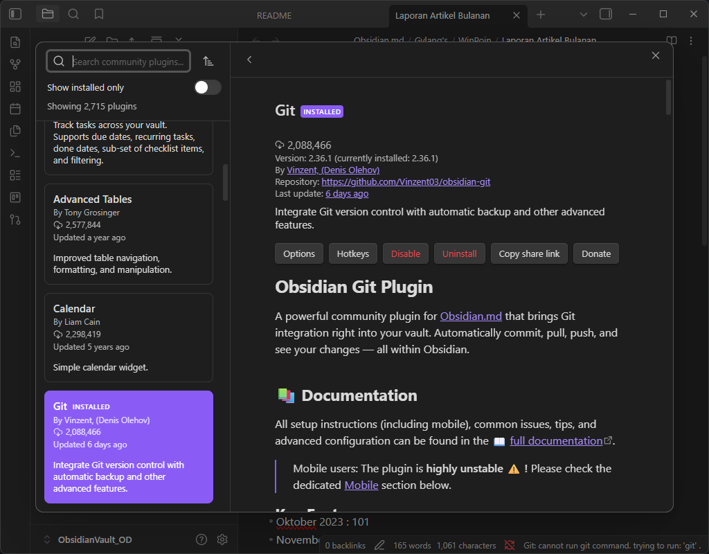 Btw nih kawan kawan, untuk mempermudah, kamu juga bisa memakai plugin seperti Obsidian Git yang memungkinkan commit dan push langsung dari dalam Obsidian tanpa harus buka terminal setiap saat.