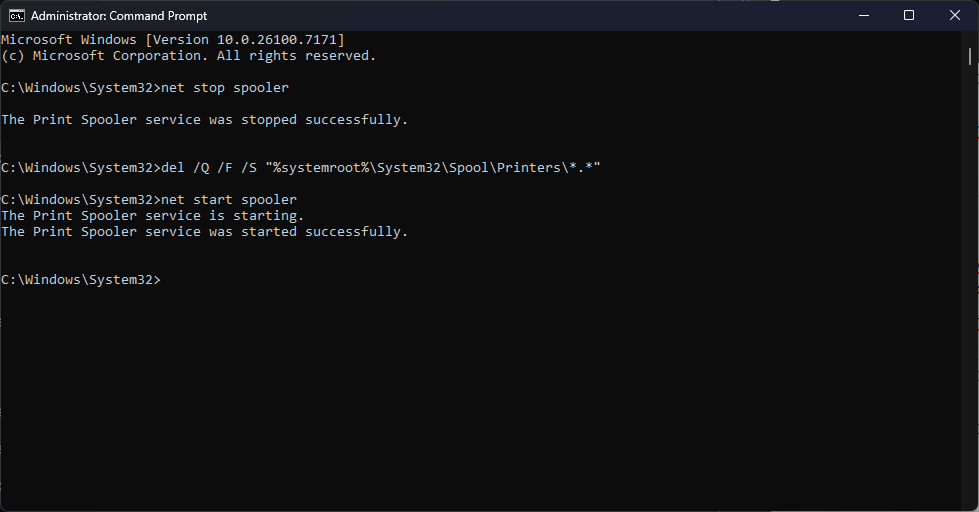 del /Q /F /S "%systemroot%\System32\Spool\Printers\*.*"