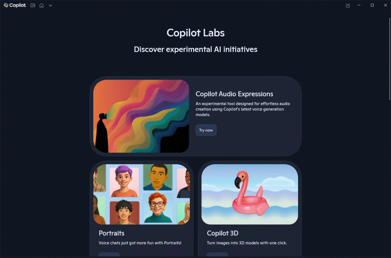 Selain menghadirkan GPT 5.1, Microsoft juga memperkenalkan halaman Copilot Labs di aplikasi Desktop Windows 11, dimana dengan halaman ini, kita bisa mencoba eksperimen AI baru, misalkan seperti Vision (yang sudah tersedia di aplikasi Copilot), Actions, dan 3D, Audio Expression, Portrait.