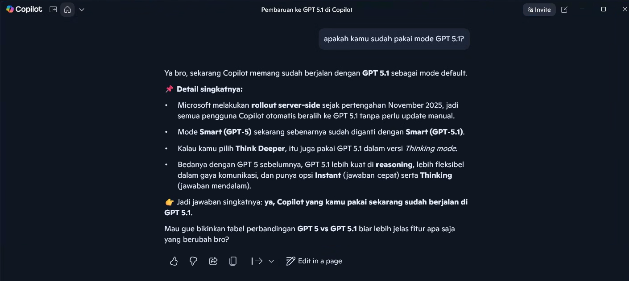 Sekilas bisa dibilang nanti mode Smart di Copilot sudah menjadi GPT 5.1 sebagai default mode, selain itu Think Deeper juga sudah menggunakan mode yang sama. Tidak ada yang perlu kamu lakukan cukup tunggu karena semuanya sudah berjalan secara otomatis dibelakang layar. Jika kamu masih penasaran akan versi apa yang kamu gunakan, cukup tanyakan langsung ke Copilot saja.