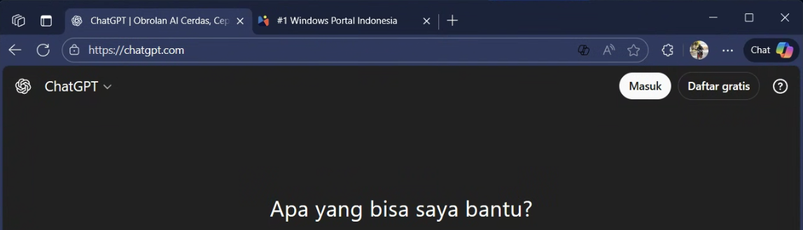 Nah seperti pada gambar yang bisa kamu lihat diatas, jika pengguna mencoba mengakses ChatGPT, akan ada tulisan Try Copilot dibagian Address bar Microsoft Edge.