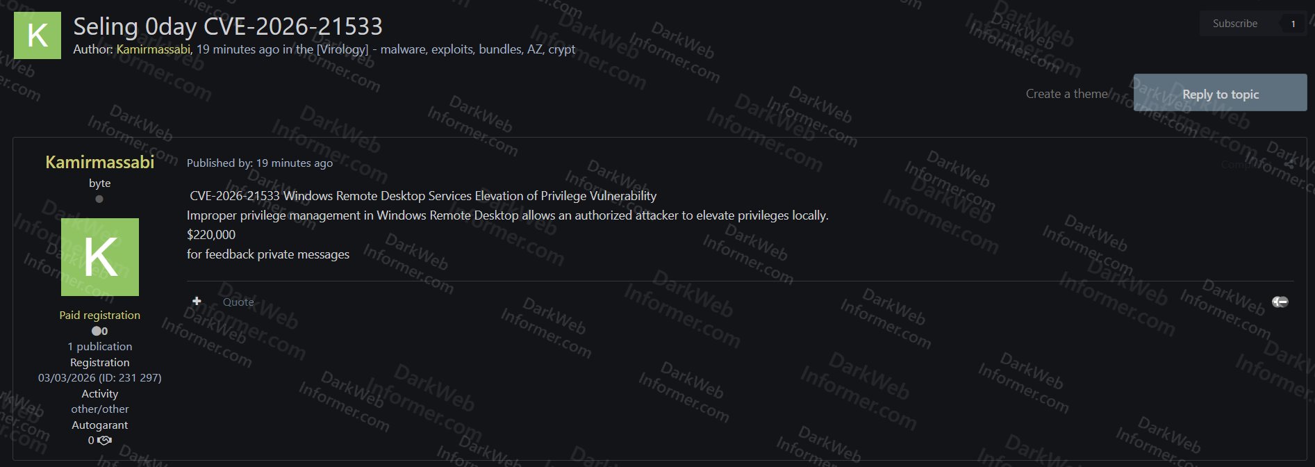 Menurut laporan dari akun X Dark Web Informer, seorang penjual dengan nama Kamirmassabi memposting iklan di forum hacking yang menawarkan eksploit untuk kerentanan kritis di Windows.