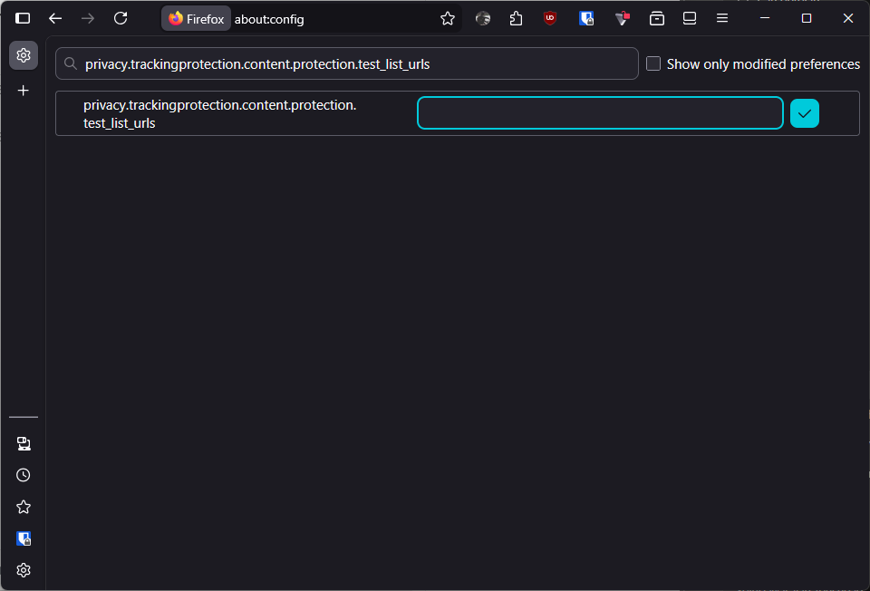 - privacy.trackingprotection.content.protection.test_list_urls: URL daftar filter untuk pemblokiran
