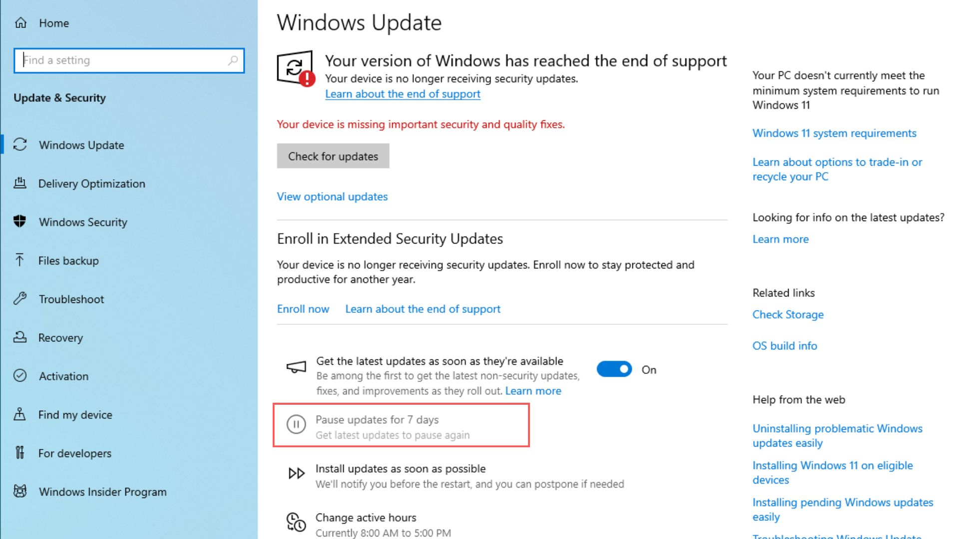 Baru baru ini pengguna Windows 10 yang tidak terdaftar dalam program Extended Security Update / ESU menemukan bahwa fitur pause update di Windows Update tampak faded atau tidak bisa diklik.