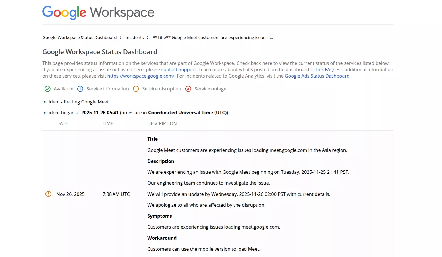 “Google Meet customers are experiencing issues loading meet.google.com in the Asia region.”
