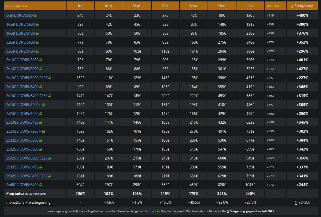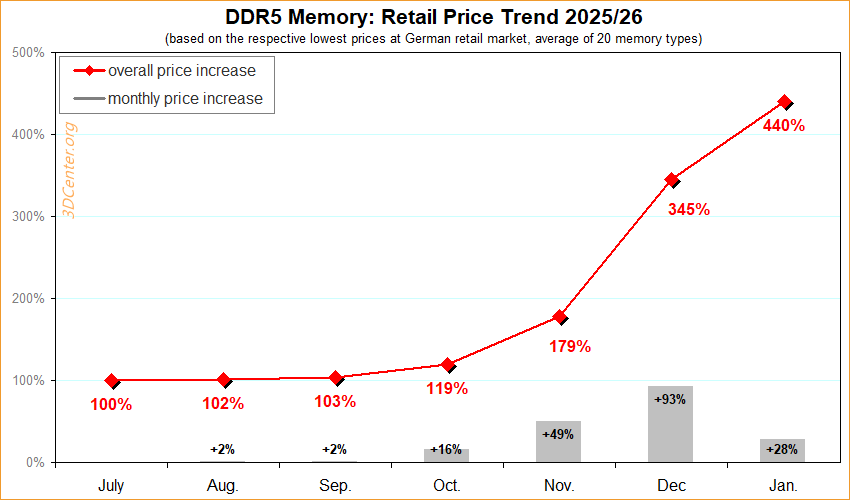 Berdasarkan data terbaru dari 3DCenter Memory Price Index, harga RAM di pasar retail Jerman terus mengalami kenaikan hingga pertengahan Januari 2026, dimana Indeks ini memantau harga RAM dari situs Geizhals dan mengecualikan listing dari eBay serta Amazon Marketplace, sehingga memberikan gambaran yang lebih stabil tentang kondisi pasar retail. Meski laporan ini berfokus pada Jerman, tekanan harga serupa juga terjadi di Amerika Serikat dan pasar global lainnya.