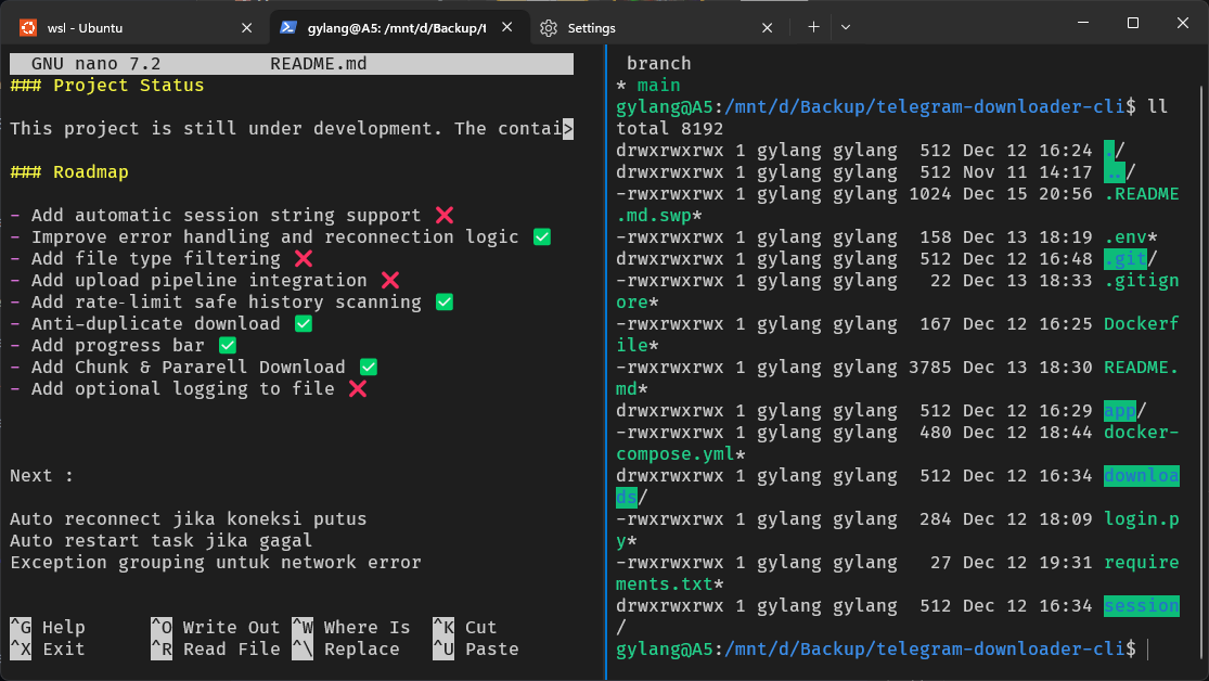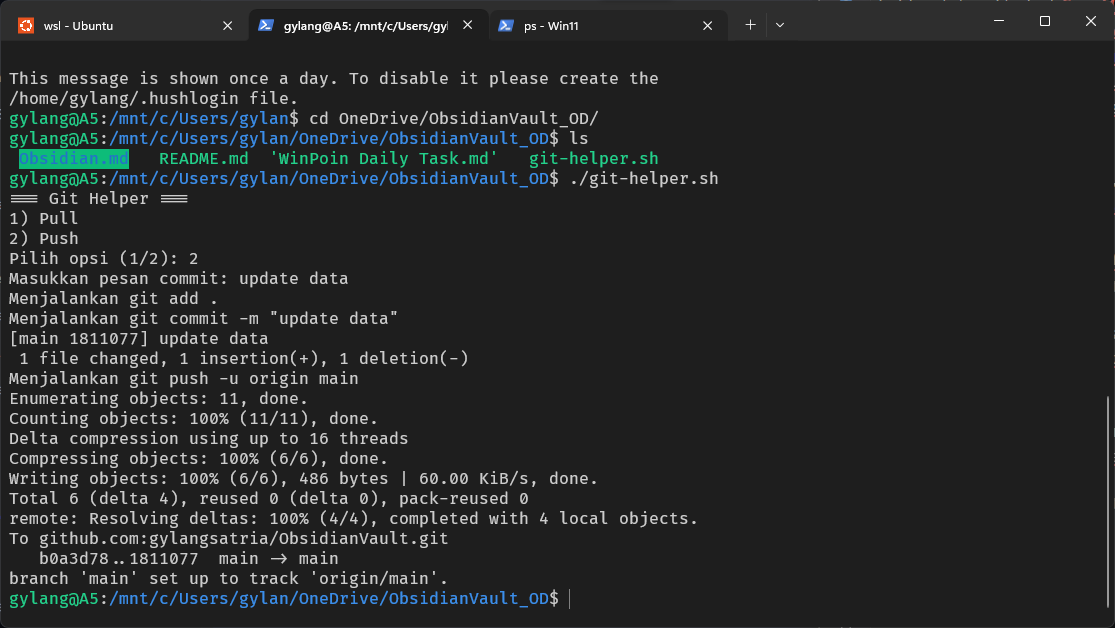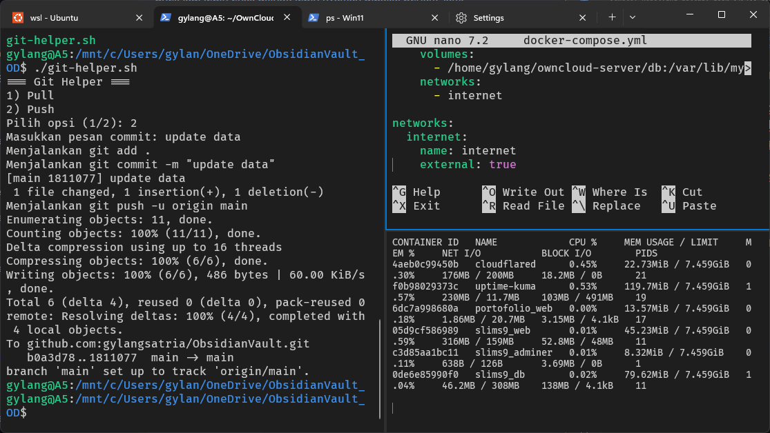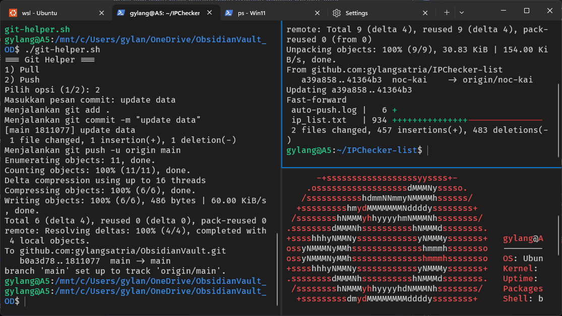 Misalkan bagian kiri untuk membuka WSL, kanan untuk Git, dan bawah untuk log, semuanya bisa barengan, dan ini membuat saya makin suka dengan Windows Terminal.