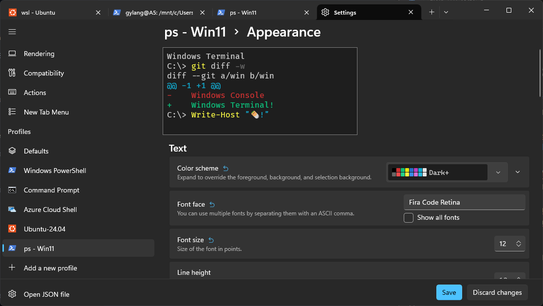 Intinya sih kita mau bikin tampilan kayak gimana, sekarang bisa langsung dari Windows Terminal itu sendiri, untuk saya sih saya biarkan default saja dengan perubahan color scheme ke Dark + dan ubah Font ke Firacode Retina untuk mendukung font ligature.