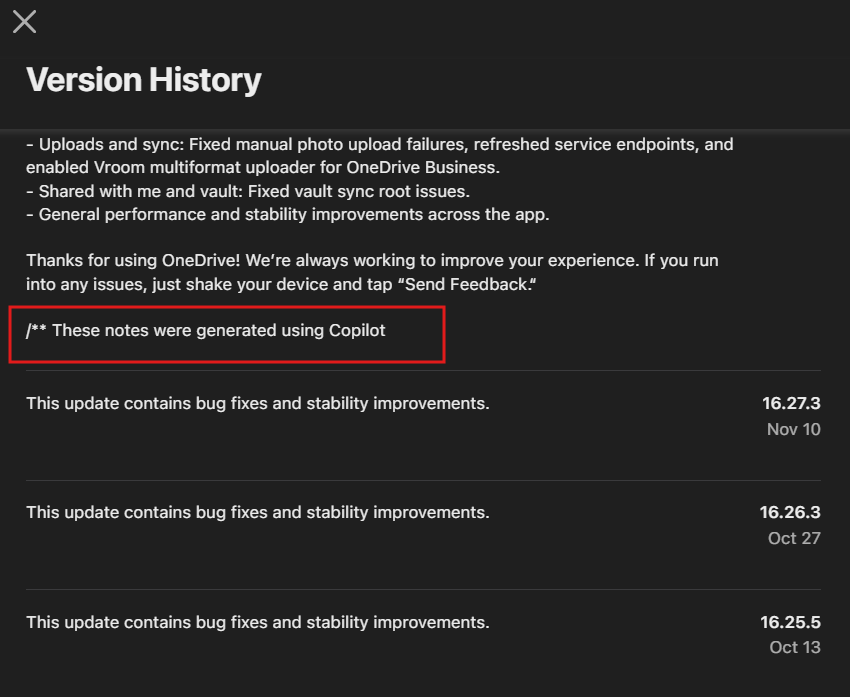Nah sebagai contoh, aplikasi OneDrive kini menampilkan tulisan “These notes were generated using Copilot” yang ada dibagian Changelog update di App Store, disisi lain, padahal Apple sama sekalil tidak mewajibkan developer untuk mengungkapkan bagaimana mereka menulis catatan.