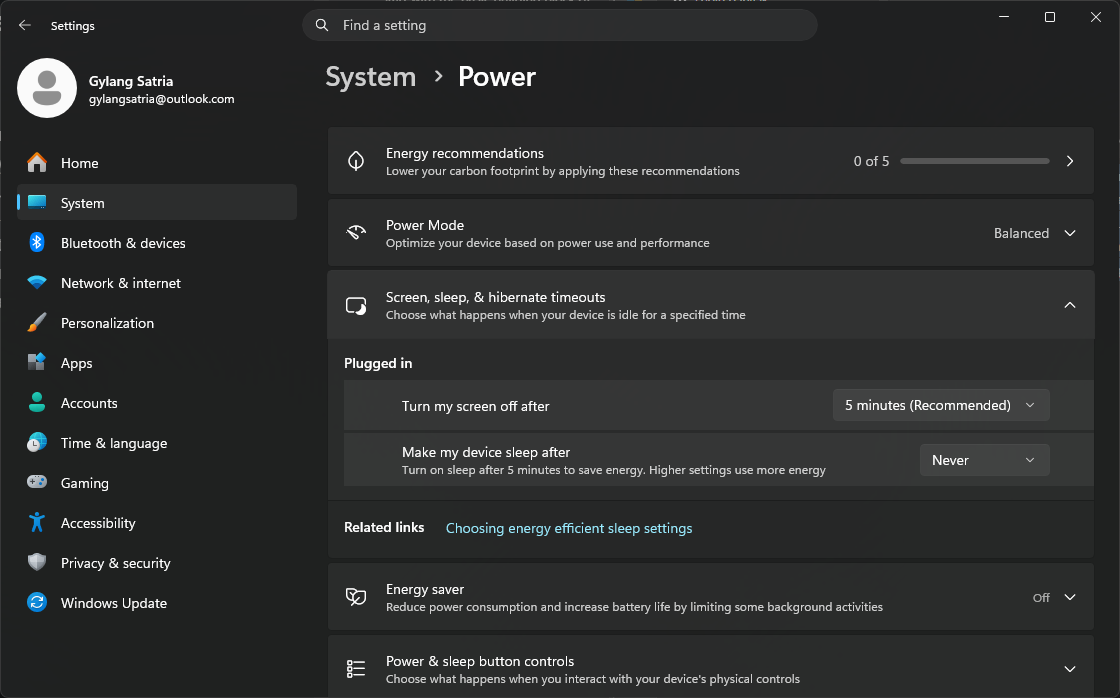 Pengaturannya bisa diakses lewat Settings > System > Power & Battery > Screen and sleep, lalu tinggal sesuaikan waktu untuk kondisi pakai baterai maupun saat terhubung ke listrik.