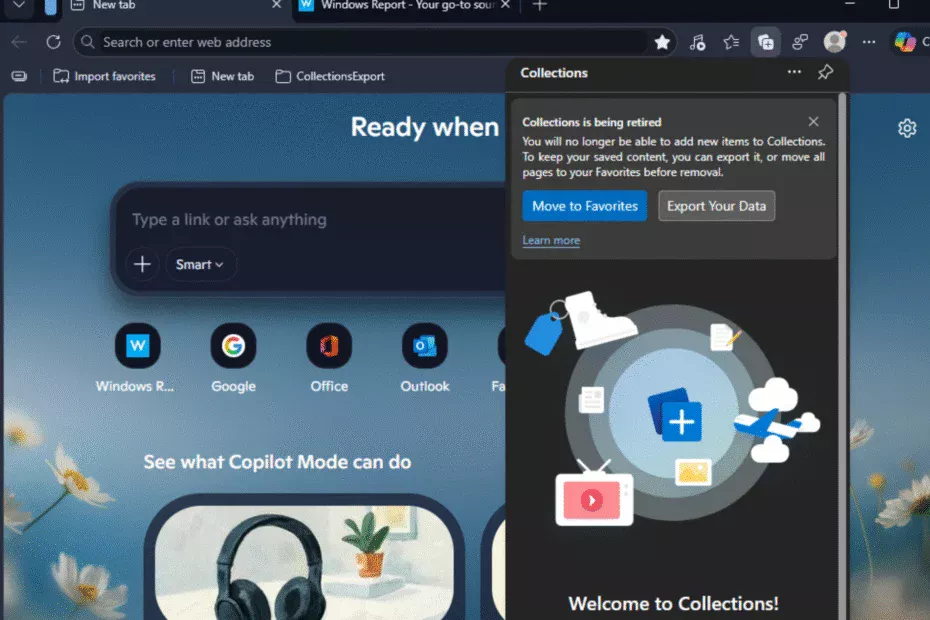"Collections is being retired. You will no longer be able to add new items to Collections. To keep your saved content, you can export it, or move all pages to your Favorites before removal."