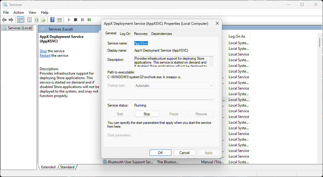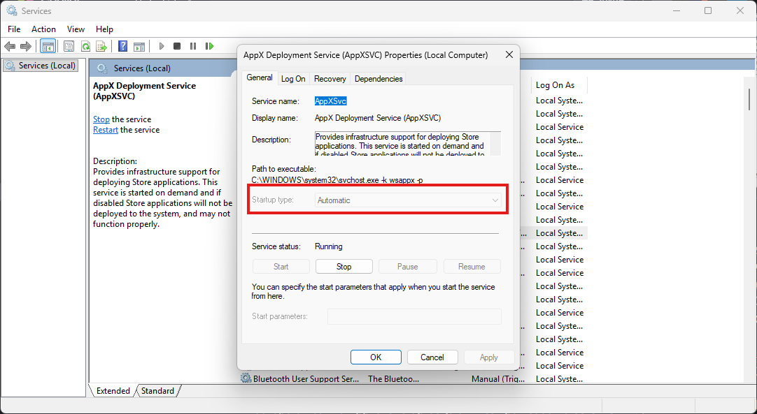 Selain itu, sayangnya tidka ada opsi untuk memanualkan kembali Appxsvc, karena Startup type di Services sendiri sudah didisable dan otomatis di Set ke Automatix.