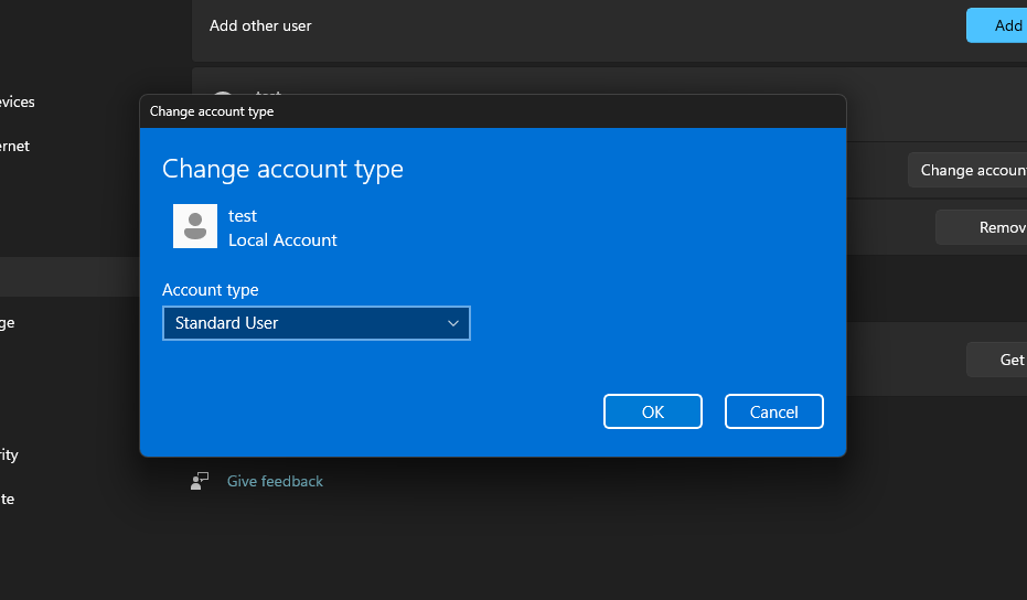 Nah sebelumnya tampilannya kurang lebih seperti pada gambar berikut, dimana tampilannya masih membawa tampilan ala Windows 10 dengan warna biru default ketika kita mencoba mengubah settings dari Other Account.