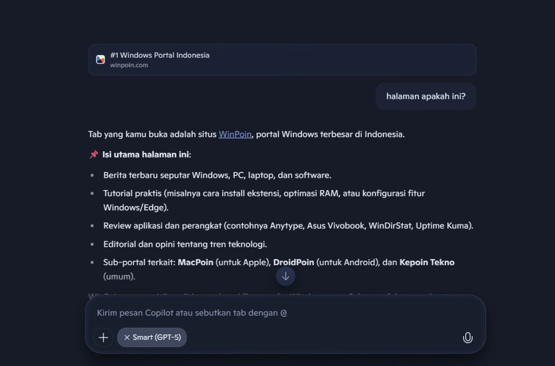 Nah setelah itu, kita bisa menanyakan konteks atau hal apapun terkait tab tersebut kepada Copilot. Berikut adalah contohnya.