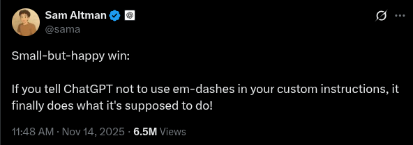 Nah kabar baiknya, OpenAI akhirnya memperbaiki masalah penggunaan em dash atau (—) di ChatGPT, dimana Sam Altman menyebut bahwa perbaikan ini sebagai perbaikan kecil namun menyenangkan “small—but—happy—win” karena kini pengguna bisa mengatur ChatGPT untuk tidak lagi mengunakan em dash via custom instructions.