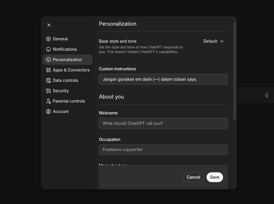 Di ChatGPT, silahkan kamu masuk ke Pengaturan / Settings > kemudian masuk ke Personalization > Isikan detail berikut di Custom instructions.