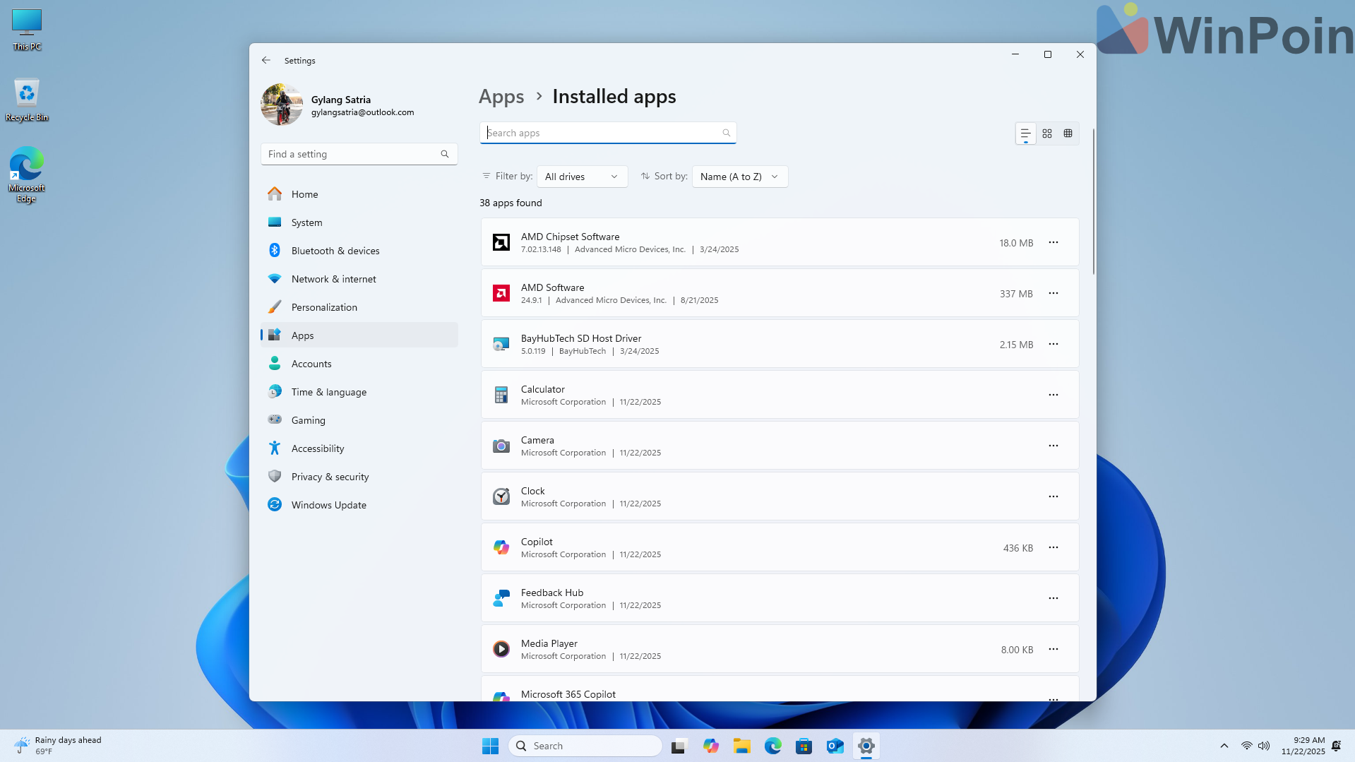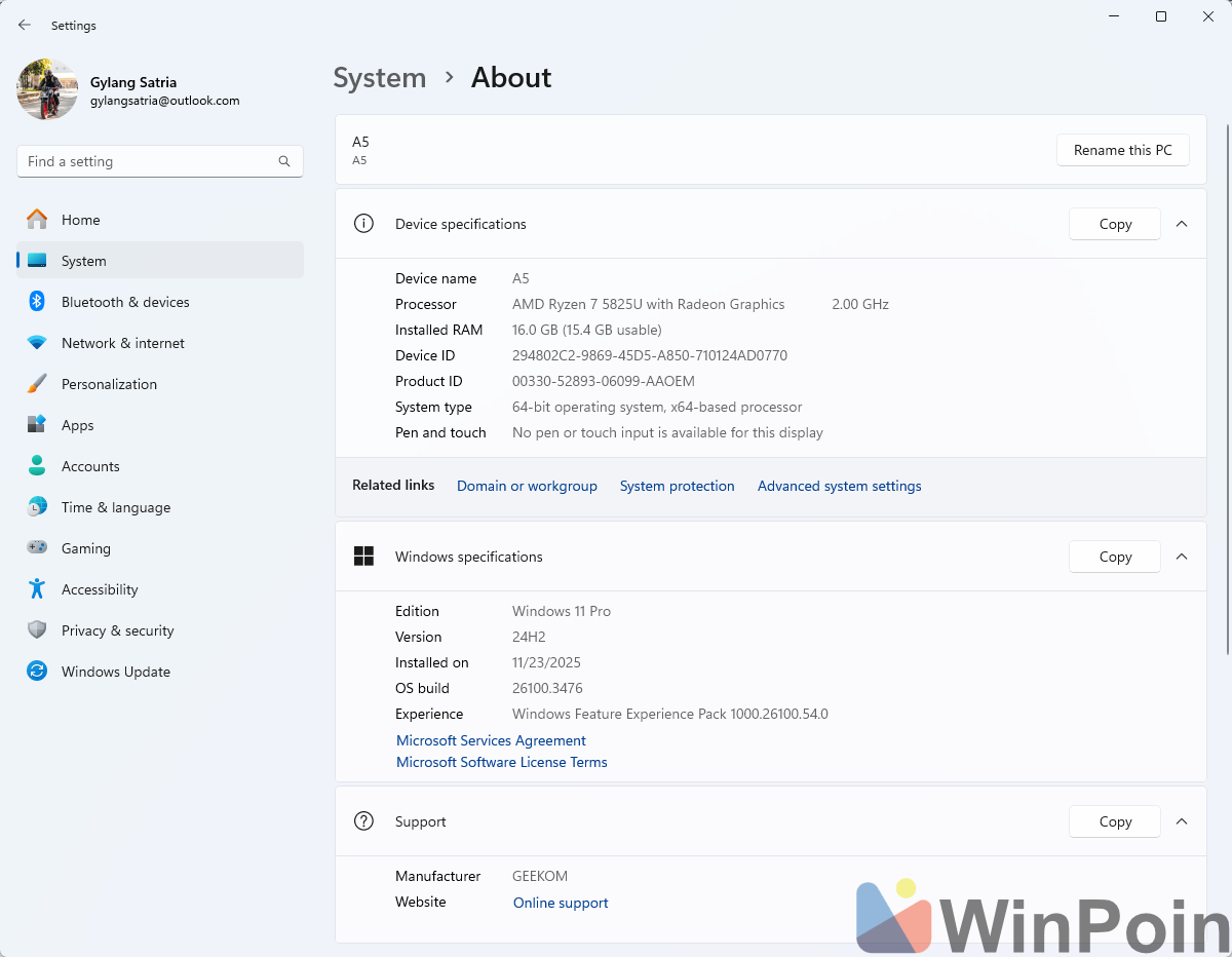 Dihalaman Settings > Apps > Installed Apps, bisa kita lihat bahwa tidak ada aplikasi lain yang terinstall seperti yang biasanya dihadirkan oleh berbagai brand lainnya. Dan ini jelas jadi nilai plus dari GEEKOM A5 R7-5825U, yang pertama dia sudah pakai Windows 11 Pro yang jelas memiliki fitur lebih lengkap dari Windows 11 Home Single Language dan dia tidak membawa bloatware tambahan yang jelas tentu kita tidak suka.