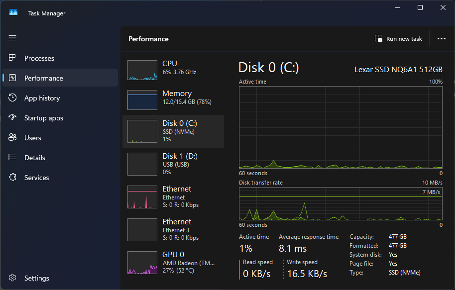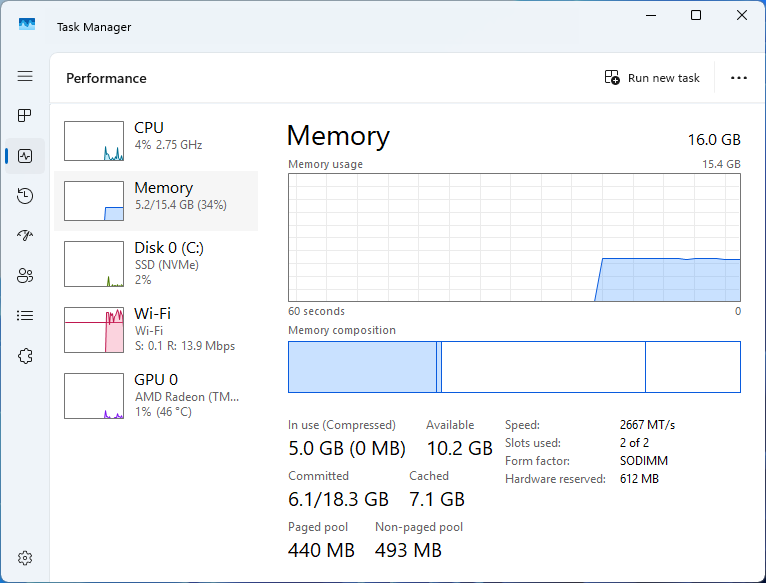 Seperti pada gambar diatas, idle dari Windows 11 setelah selesai setup pertama kali sudah memakan resource sekitar 5.2 GB. Jadi memang upgrade ke yang lebih besar akan menjadi nilai plus bagi kamu yang ingin menggunakan perangkat ini dalam jangka waktu yang lama.