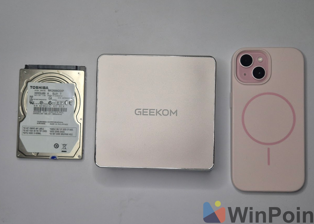 Nah salah satu nilai plus dari perangkat ini adalah ukurannya yang benar – benar compact, berikut jika kita bandingkan ukuran GEEKOM A5 R7-5825U dengan Hard Disk 2.5 Inch dan Iphone 15, beneran mini banget bukan?.