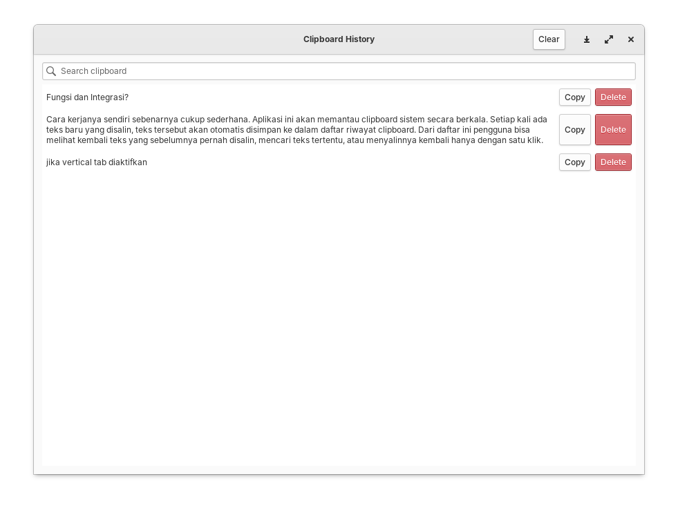 Nah beberapa aplikasi seperti Clipman, CopyQ, atau GPaste sebenarnya bisa dipasang, namun dari pengalaman saya ada saja kendalanya, mulai dari dari icon tray yang tidak muncul dengan benar, integrasi yang kurang rapi dengan sistem, sampai masalah auto start yang kadang tidak konsisten setelah login.