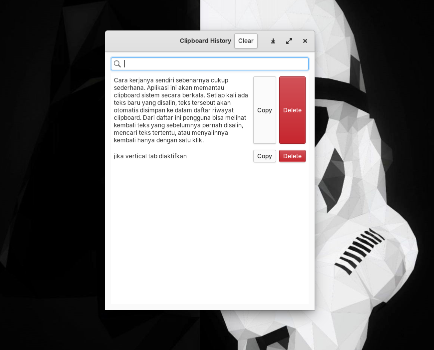 Nah aplikasi ini bernama “Clipboard History” yang saya buat menggunakan Vala dengan toolkit GTK serta Granite, sehingga tampilannya tetap terasa menyatu dengan desain khas Elementary OS yang sederhana dan minimalis. Tujuannya bukan untuk membuat aplikasi clipboard manager yang kompleks, tetapi lebih ke menyediakan fungsi dasar yang benar benar saya butuhkan sehari hari.