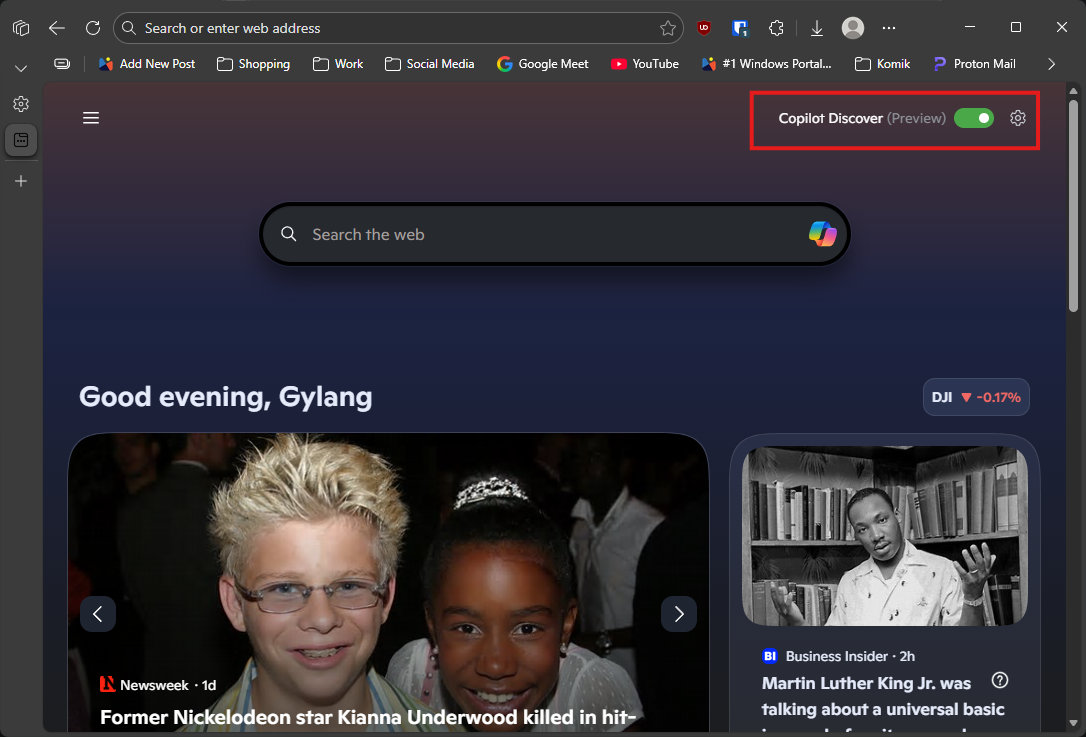 Pada halaman new tab, nonaktifkan opsi Copilot discover untuk membuat halaman new tab jadi makin minimalis tanpa ada banyak gangguan.