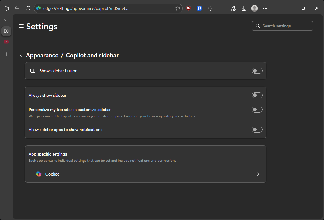 Dihalaman edge://settings/appearance/copilotAndSidebar, semua opsi yang ada disana saya disable.