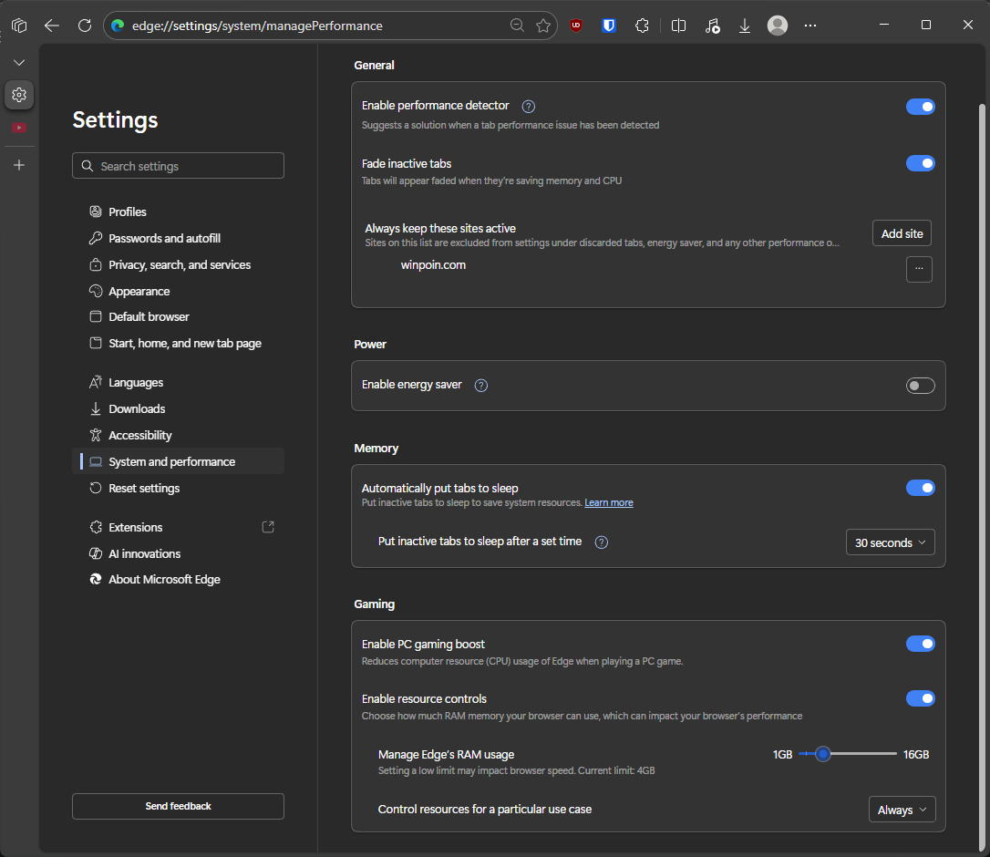 Nah untuk memastikan Edge berjalan maksimal, beberapa opsi yang ada di halaman Settings > System > Manage Performances juga saya sesuaikan, mulai dari Automatically put tab to sleep saya set ke 30 detik, limit RAM menjadi hanya 4 GB, dan aktifkan Fade in\active tab agar saya tahu tab mana yang sedang aktif dan memakan resource dan yang sudah masuk ke mode sleep.