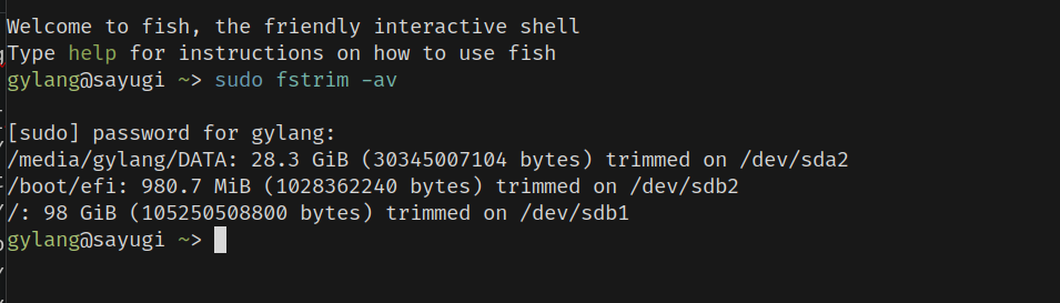 gylang@sayugi ~> sudo fstrim -av